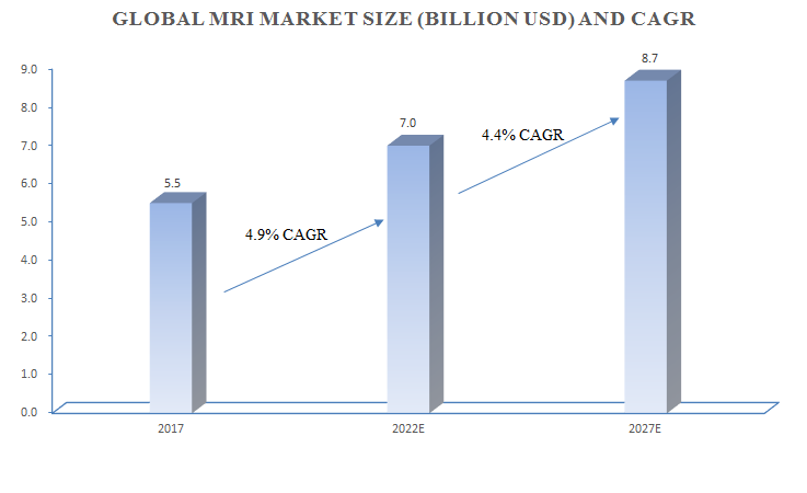The global market for MRI was $5.5 billion in 2017, growing to $7.0 billion in 2022, with a CAGR of 4.9% from 2017 to 2022. Driven by the emerging market demand, the global market for MRI is expected to reach $8.7 billion in 2027, with a CAGR of 4.4% from 2022 to 2027.