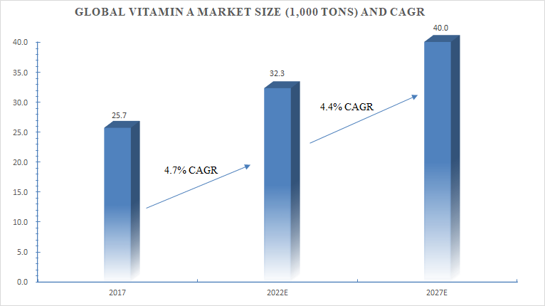 The global vitamin A market size was 25,700 tons in 2017, growing to 32,300 tons in 2022, with a CAGR of 4.7% from 2017 to 2022. The global vitamin A market size is expected to grow to 40,000 tons in 2027, with a CAGR of 4.4% from 2022 to 2027.