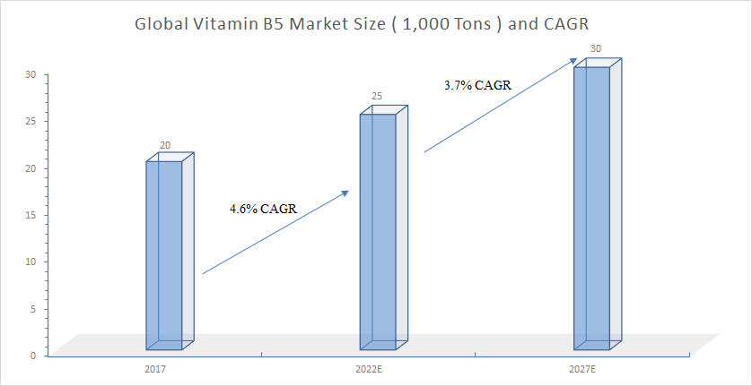 The global vitamin B5 market size was 20,000 tons in 2017, growing to 25,000 tons in 2022, with a CAGR of 4.6% from 2017 to 2022. The global vitamin B5 market size is expected to grow to 30,000 tons in 2027, with a CAGR of 3.7% from 2022 to 2027.