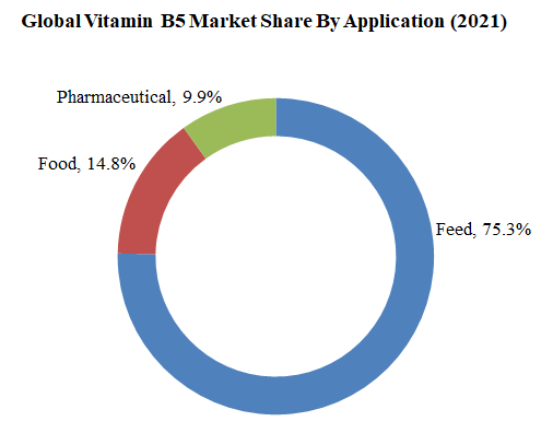 Vitamin B5 is mainly used in animal feed, food additives and pharmaceuticals. Animal feed is the largest end-use for vitamin B5 and accounts for 75.3% market share.