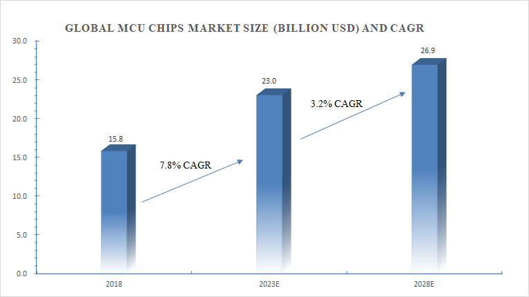 The global MCU chip market exhibited robust growth in recent years and is projected to maintain its upward trajectory. In 2018, the market was valued at $15.8 billion, and by 2023, it is expected to reach $23.0 billion, reflecting a compound annual growth rate (CAGR) of 7.8% during this period. Looking ahead to 2028, the market is predicted to expand further to $26.9 billion, with a CAGR of 3.2% from 2023 to 2028. This steady growth demonstrates the enduring demand for MCU chips in an increasingly interconnected world.