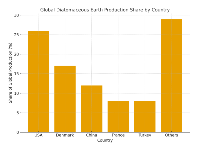 Global production is concentrated in a handful of countries. The United States leads the market, accounting for 25 to 27 percent of total output, followed by Denmark with 16 to 18 percent, China with 11 to 13 percent, France at 7 to 9 percent, and Turkey also at 7 to 9 percent. Argentina, Mexico, and Peru contribute additional production of approximately 100,000 tons per year combined, highlighting the global distribution of diatomite resources.
