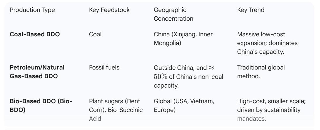 The BDO market faces a potential pricing squeeze as low-cost coal-based capacity in China expands rapidly, simultaneously competing with and supplying the premium-priced biodegradable plastics segment, which is increasingly favoring sustainable Bio-BDO inputs.