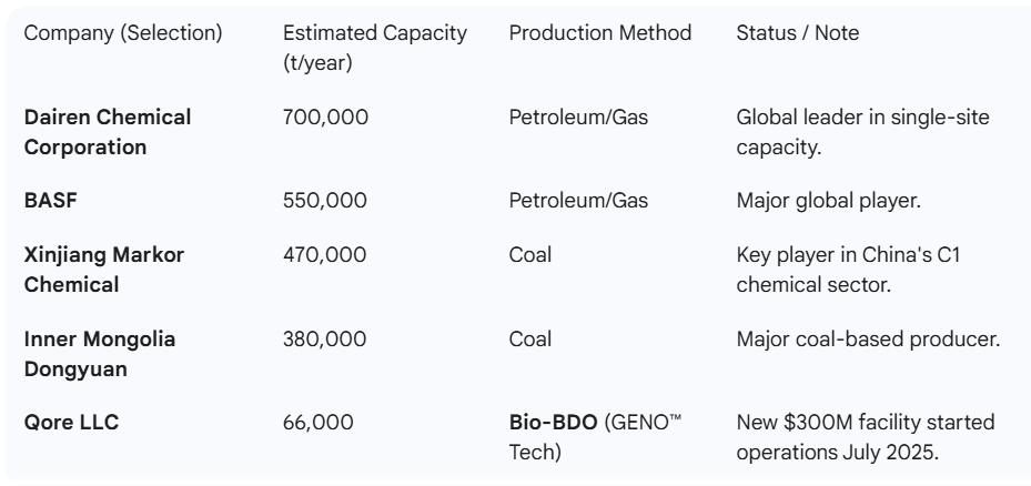 Qore LLC: Started a 66,000 t/year Bio-BDO plant in July 2025, using corn sugar as a renewable feedstock.