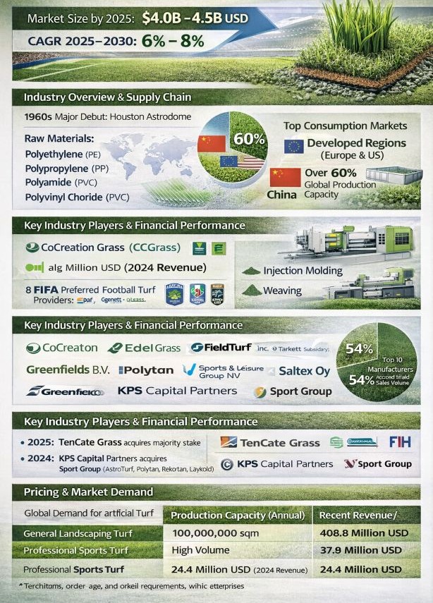 The global synthetic turf market has demonstrated robust growth resilience, reaching a valuation between 4.0 billion USD and 4.5 billion USD in 2025. Fueled by expanding applications in professional sports and residential landscaping, the industry is projected to maintain a Compound Annual Growth Rate (CAGR) of 6% to 8% through 2030.