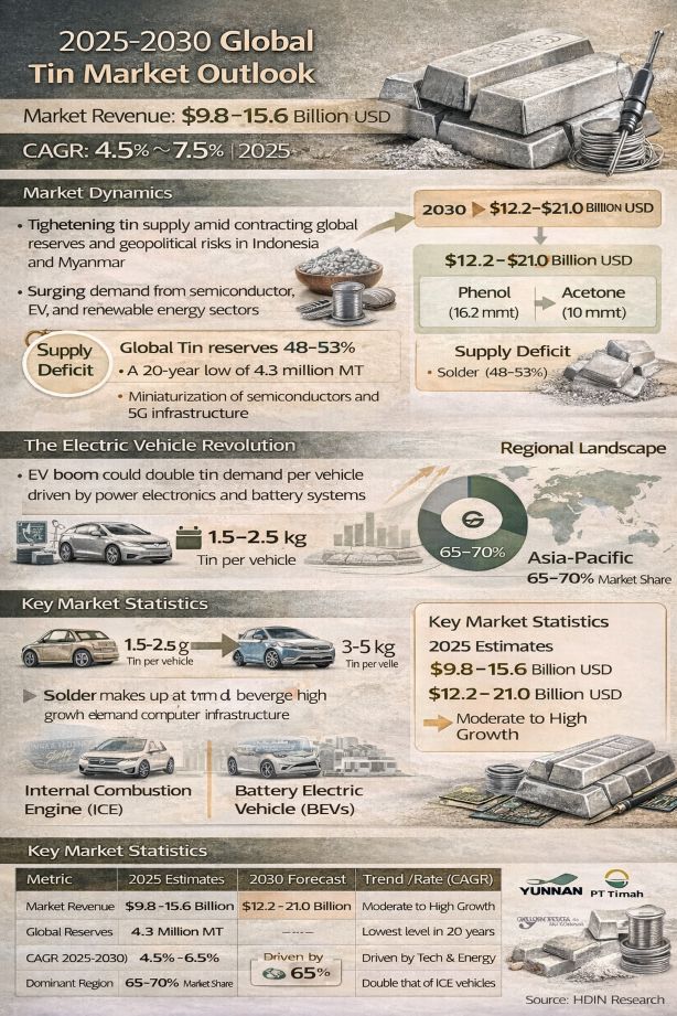 HDIN Research has released its latest comprehensive study titled "Tin (Sn) Global Market Insights 2025." The report provides an in-depth analysis of the global tin industry, highlighting a critical divergence between tightening raw material supplies and accelerating demand from the semiconductor, electric vehicle (EV), and renewable energy sectors. As of the base year 2025, the global market is valued between 9.8 billion USD and 15.6 billion USD.