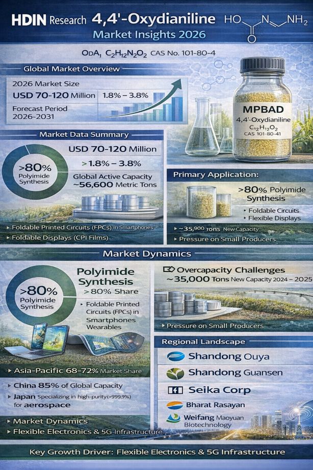 HDIN Research has released its latest comprehensive industry report titled "4,4-Oxydianiline Market Insights 2026." The report provides an in-depth analysis of the global supply chain, pricing dynamics, and demand drivers for 4,4-Oxydianiline (ODA), a critical monomer used in the production of high-performance polyimide materials.