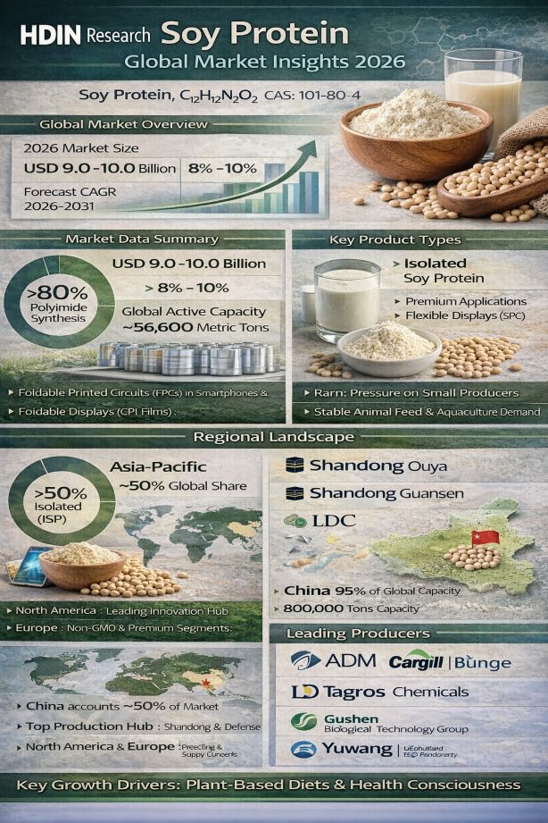 HDIN Research has announced the release of its latest comprehensive industry report, Soy Protein Global Market Insights 2026. The study provides an in-depth evaluation of the market landscape, revealing that the global soy protein sector has reached a valuation of USD 9.0 billion to USD 10.0 billion in 2026. The market is projected to expand at a compound annual growth rate (CAGR) of 8% to 10% through 2031, potentially reaching USD 16.1 billion by the end of the forecast period.