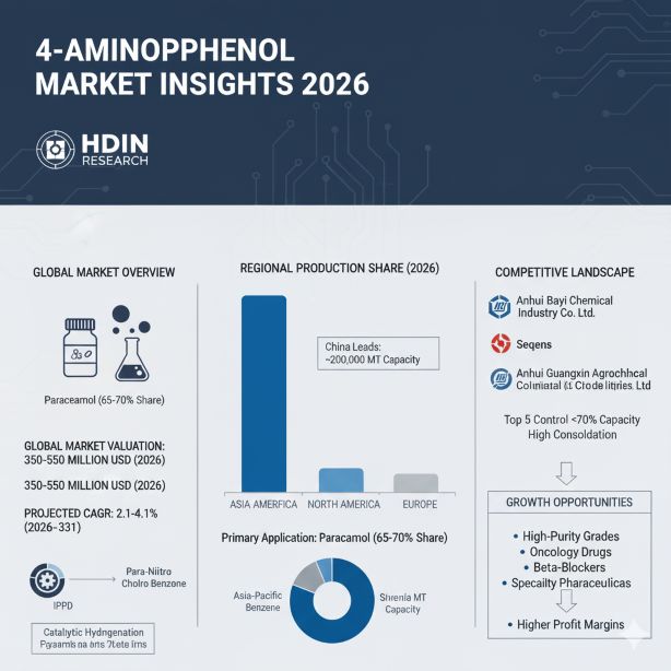 HDIN Research has officially released its latest market intelligence report titled 4-Aminophenol Market Insights 2026. The comprehensive study analyzes the critical pharmaceutical intermediate sector, valuing the global market between 350 million and 550 million USD for the current year. The report forecasts a compound annual growth rate (CAGR) of 2.1% to 4.1% through 2031, supported by the steady expansion of the global healthcare sector and over-the-counter analgesic consumption.