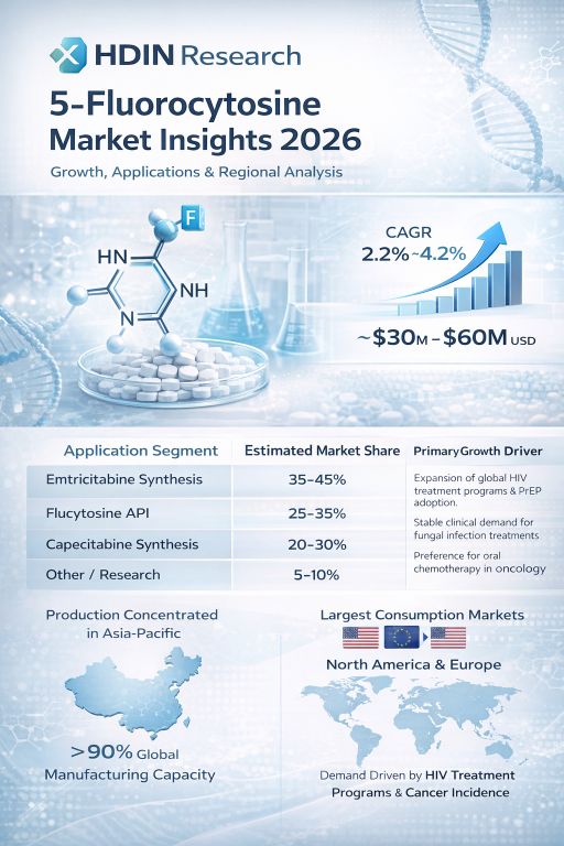 HDIN Research has announced the release of its latest comprehensive market analysis titled "5-Fluorocytosine Market Insights 2026." The report details the growth trajectory of the global 5-Fluorocytosine (5-FC) industry, projecting a compound annual growth rate (CAGR) of 2.2% to 4.2% from 2026 through 2031. As a critical pharmaceutical intermediate and active pharmaceutical ingredient, the market valuation is estimated to range between 30 million and 60 million USD in 2026.