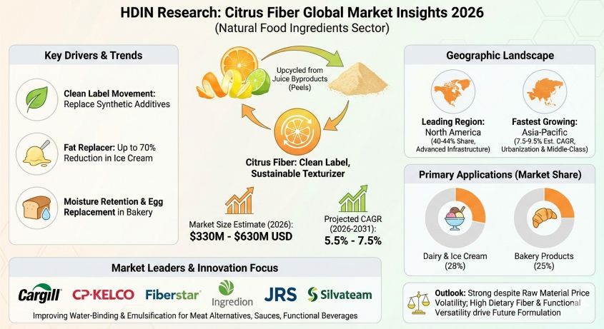 HDIN Research has released its latest industry analysis titled "Citrus Fiber Global Market Insights 2026," offering a comprehensive outlook on the natural food ingredients sector. The report estimates the global citrus fiber market value to range between 330 million and 630 million USD in 2026, with a projected compound annual growth rate (CAGR) of 5.5% to 7.5% from 2026 through 2031.