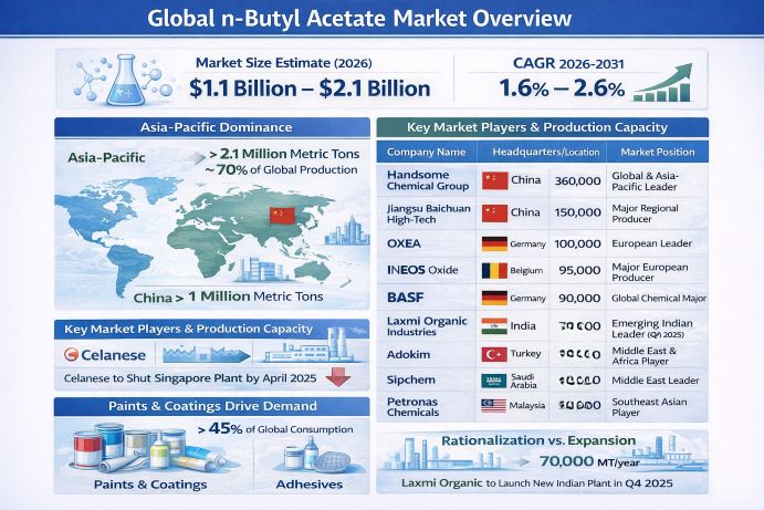While Celanese has announced the strategic rationalization of its global footprint with the planned closure of its Singapore operations in April 2025, new players are entering the fray to capture growing local demand. Most notably, Laxmi Organic Industries is establishing India's first dedicated n-Butyl Acetate facility with a capacity of 70,000 metric tons, expected to be operational by Q4 2025.