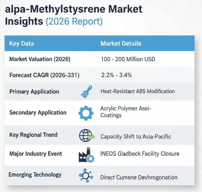 HDIN Research, a leading independent market consulting firm, has officially released its latest industry study titled alpha-Methylstyrene Market Insights 2026. The comprehensive report analyzes the global supply chain, production technologies, and demand drivers for this critical specialty monomer, projecting a market valuation between 100 million and 200 million USD for the current year.