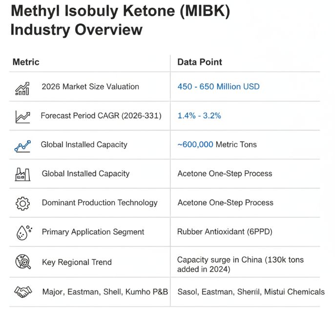 According to the latest data from HDIN Research, the global MIBK market is valued between 450 and 650 million USD for the fiscal year 2026. The industry is projected to maintain a moderate growth trajectory with a Compound Annual Growth Rate (CAGR) of 1.4% to 3.2% through 2031. The global production capacity currently stands at approximately 600,000 metric tons annually.