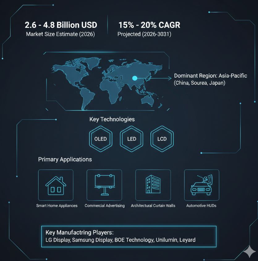 Recent market developments highlight the transition from prototypes to commercial products. The report details the launch of the LG Signature OLED T in the Gulf region in late 2025, marking a significant milestone for consumer-grade transparent televisions. Additionally, developments in Micro-LED technology, such as dual-sided transparent displays demonstrated by AUO, are pushing the boundaries of resolution and transparency.