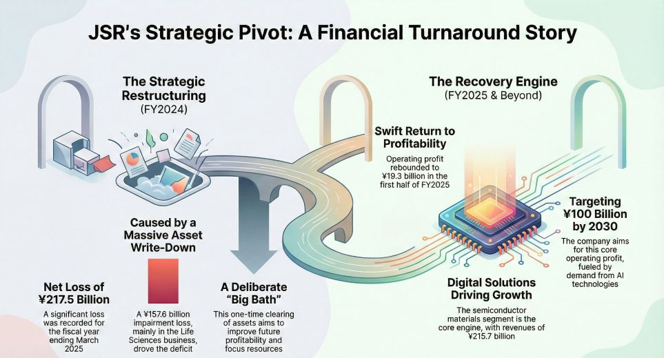 According to HDIN Research analysis, JSR Corporation reported a net loss attributable to owners of the parent of 217.5 billion JPY for the fiscal year ending March 2025 (FY2024). This substantial loss was primarily driven by a strategic "financial big bath," involving impairment losses of approximately 157.6 billion JPY, largely related to goodwill and intangible assets in its Life Sciences division.