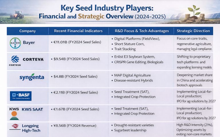 The competitive environment has evolved from selling single-trait seeds to offering integrated systems comprising seeds, crop protection, and digital services. Major industry players are leveraging high R&D intensity to maintain market leadership. The report utilizes the following data to summarize the strategic positioning of key global seed producers: