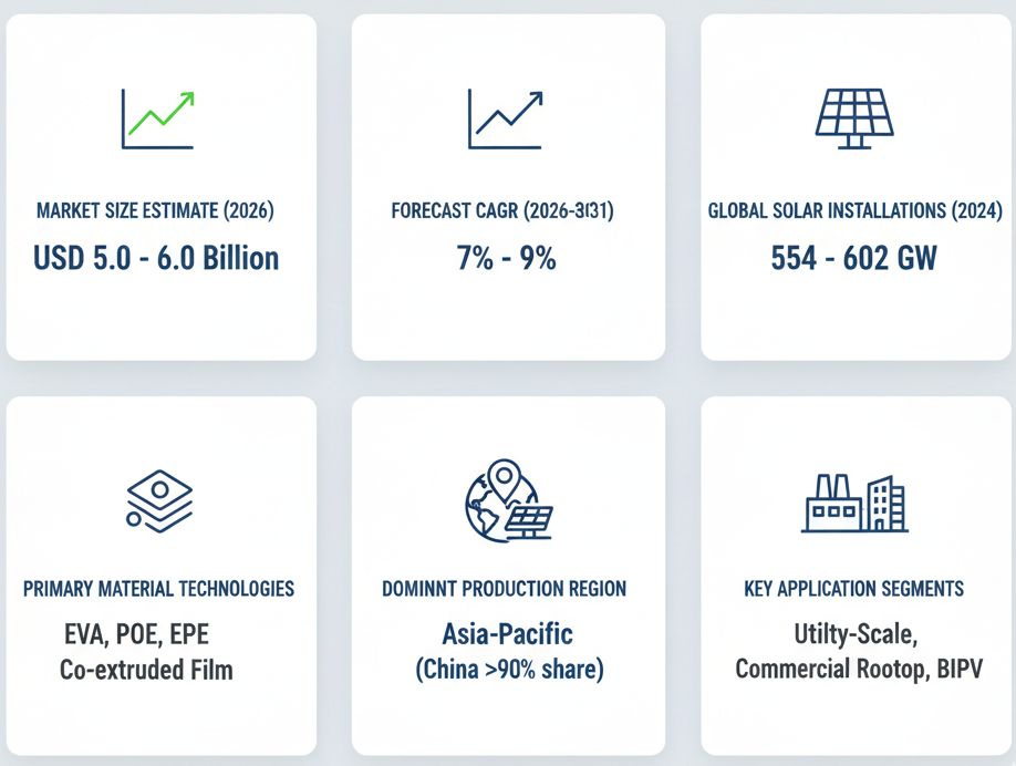 Driven by the unprecedented deployment of solar photovoltaic capacity worldwide, the market is expected to expand at a compound annual growth rate (CAGR) of 7% to 9% from 2026 through 2031. Solar encapsulation films, which protect solar cells from environmental damage while maintaining optical transparency, are evolving rapidly to meet the demands of next-generation module technologies.
