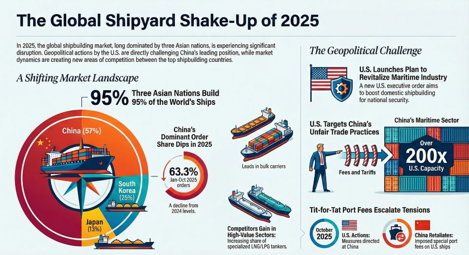 South Korea (HD Hyundai, Samsung Heavy Industries, Hanwha Ocean) maintains a technical lead in high-value-added sectors. South Korean yards have adopted a selective ordering strategy, focusing on high-margin LNG and ammonia-ready vessels. HD Hyundai expects its operating profit margin to reach 15 percent by 2026.