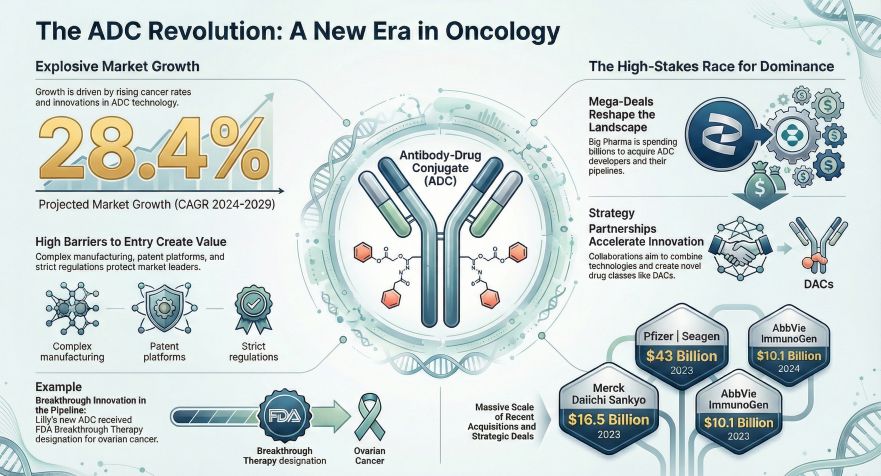 The competitive landscape has shifted from internal R&D to aggressive mergers and acquisitions (M&A) and strategic licensing. Multinational pharmaceutical companies are heavily investing to secure dominant positions. Notable transactions include Pfizer’s $43 billion acquisition of Seagen and AbbVie’s $10.1 billion purchase of ImmunoGen. These deals highlight a trend where major players are acquiring established technology platforms to fill pipeline gaps caused by patent expirations.