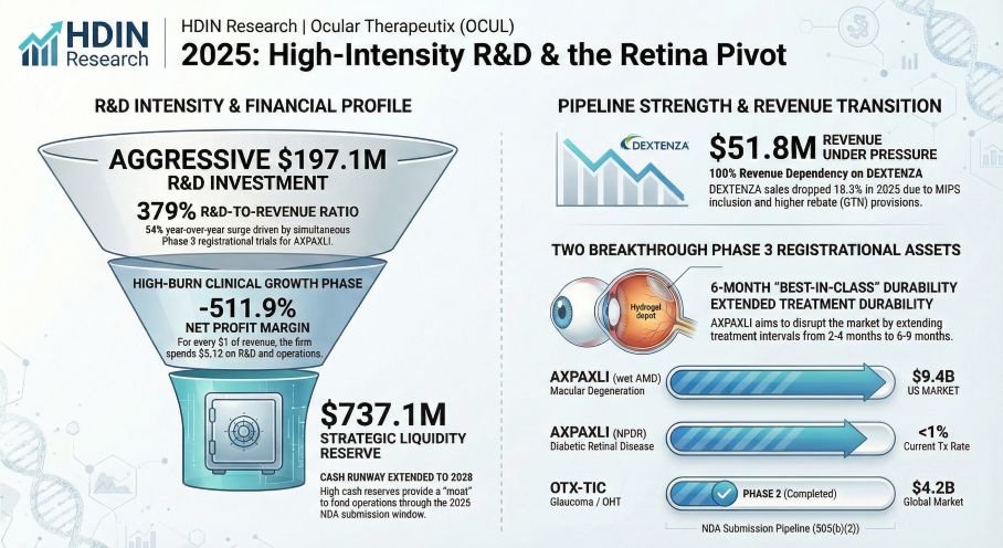 * Commercial Challenges for DEXTENZA: While DEXTENZA generated $51.8 million in gross sales, net revenue was heavily impacted by Gross-to-Net (GTN) provisions, which surged to 51.6% in 2025 (up from 38.5% in 2024). This underscores the necessity of the strategic pivot toward the higher-margin retinal pipeline.