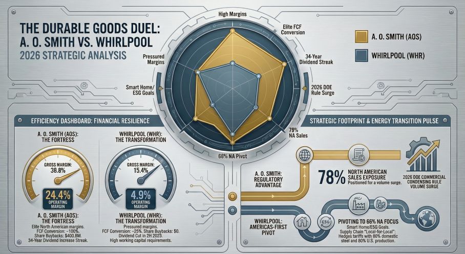 While the broader industry navigates macroeconomic volatility, HDIN Research identifies a stark bifurcation in corporate strategy. A. O. Smith (AOS) is leveraging a "Fortress" balance sheet to capture regulatory-driven growth, whereas Whirlpool (WHR) is engaged in a complex structural transformation to defend its core Americas business against credit-rating headwinds.