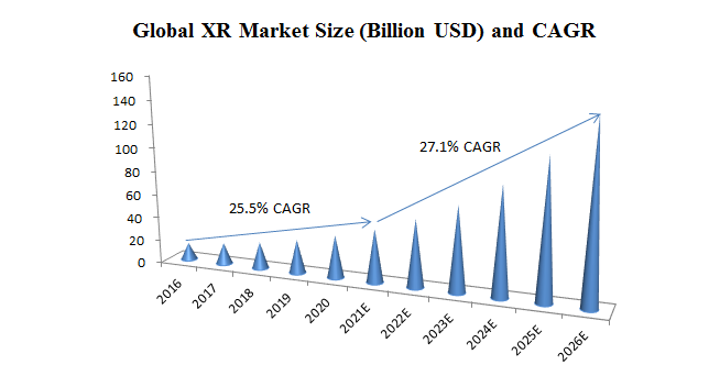 The global market size of XR is 14.41 billion USD in 2016, and the global market size of XR reaches 44.90 billion USD in 2021, with a CAGR of 25.5% from 2016 to 2021. With the rapid development of smartphones and 5G, the market demand for XR technology and equipment will boom in the future, and the global market size of XR is expected to increase to $114.87 billion in 2026, with a CAGR of 27.1% from 2021 to 2026.