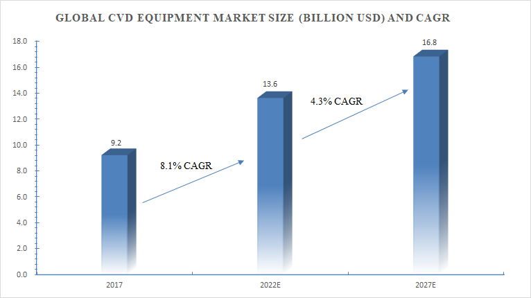 The global CVD equipment market size was USD 9.2 billion in 2017, growing to USD 13.6 billion in 2022, with a CAGR of 8.1% from 2017 to 2022. The global CVD equipment market size is expected to grow to USD 16.8 billion in 2027, with a CAGR of 4.3% from 2022 to 2027.